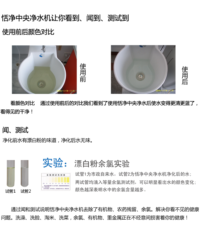 恬凈中央凈水機(jī)有效去除水中的異色、異味;進(jìn)一步濾除水中微小雜質(zhì)、膠狀體;去除水中的漂白粉余氯、農(nóng)藥、重金屬;保留對(duì)人體有益的礦物質(zhì)。使水變得碧清、碧藍(lán),去除對(duì)人體有害的物質(zhì)。