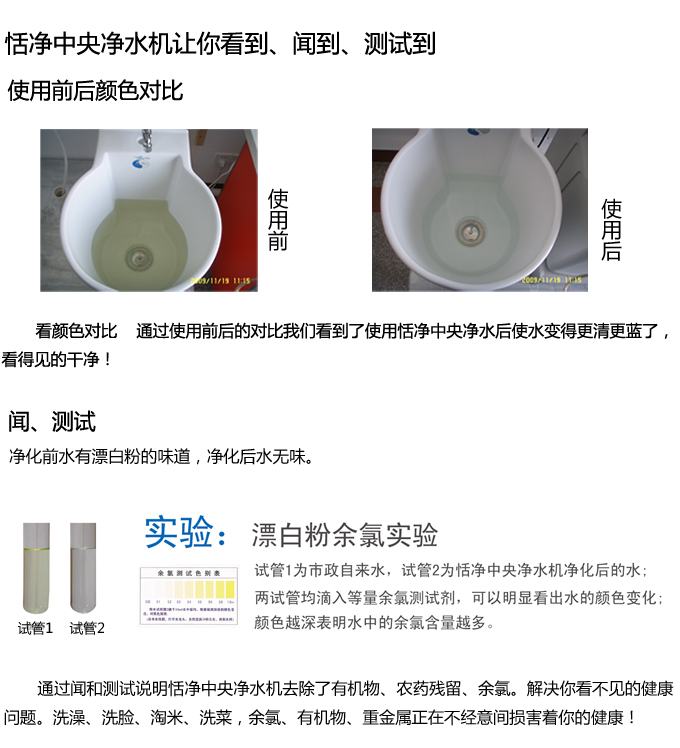 全屋凈水中央凈水機有效去除水中的異色、異味;進一步濾除水中微小雜質、膠狀體;去除水中的漂白粉余氯、農藥、重金屬;保留對人體有益的礦物質。使水變得碧清、碧藍,去除對人體有害的物質。